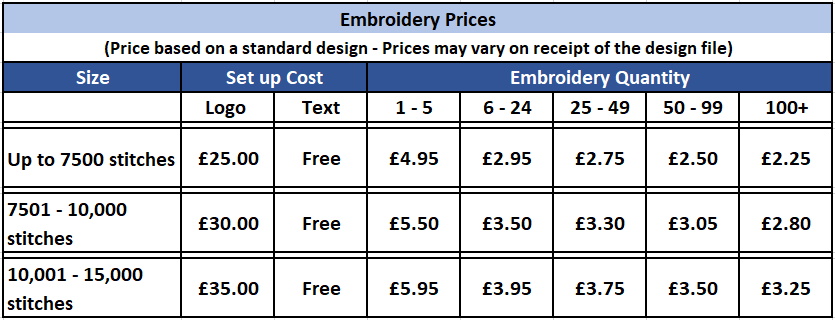 We have shown examples of the cost of our embroidery in the table below. This is a guide only as once we know of your requirement and have seen your logo design then we can confirm the price.